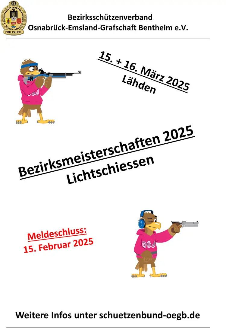 Der Schützenbund Osnabrück – Emsland – Grafschaft Bentheim führt Bezirksmeisterschaft im Lichtschießen für die Geburtsjahrgänge 2012 bis 2018 als Einzel- und Mannschaftswertung durch. Jeder Jahrgang stellt eine eigene Wettkampfklasse.